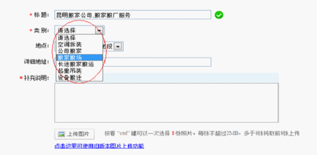2、填写标题,比如:“昆明搬家公司,搬家搬厂服务”,如下图: